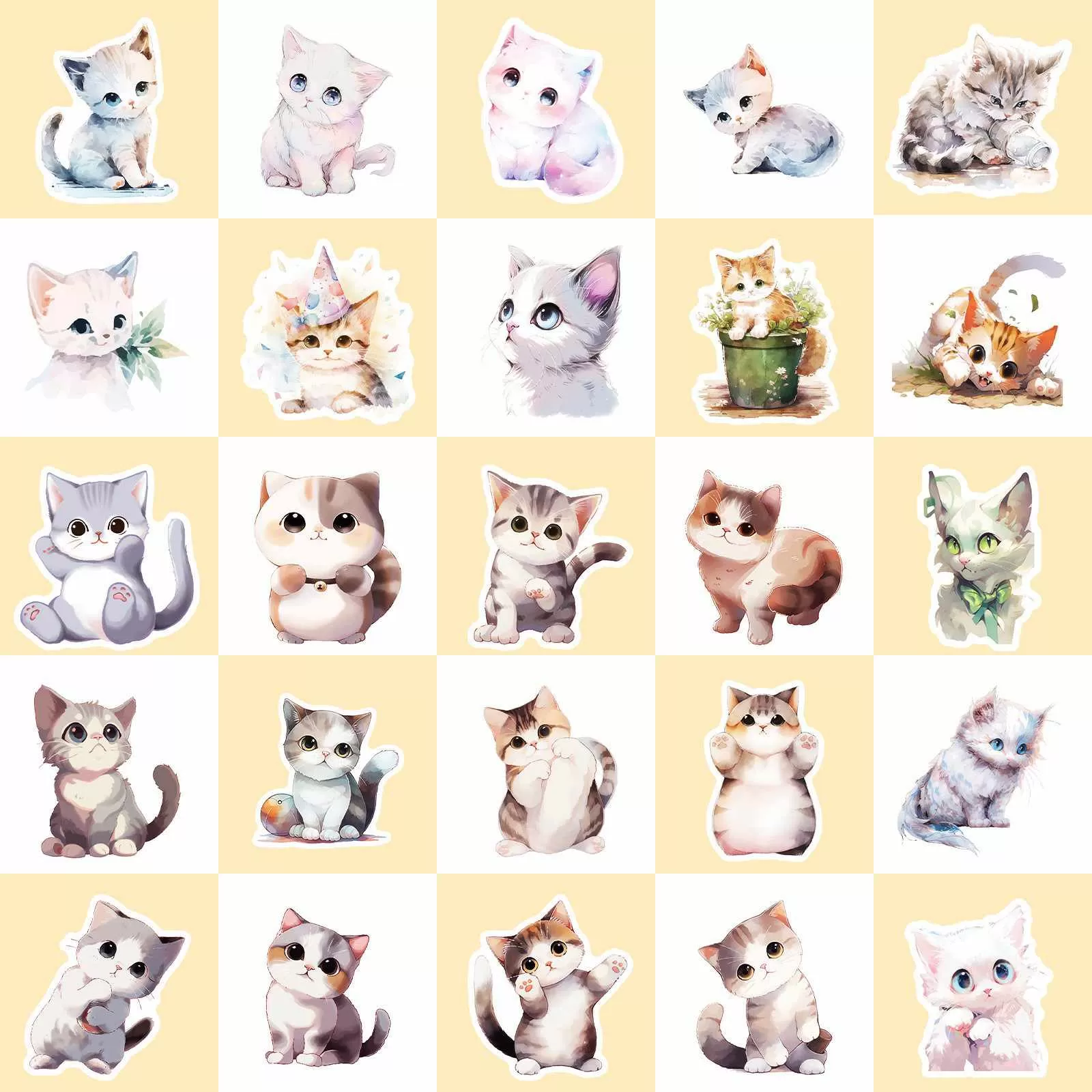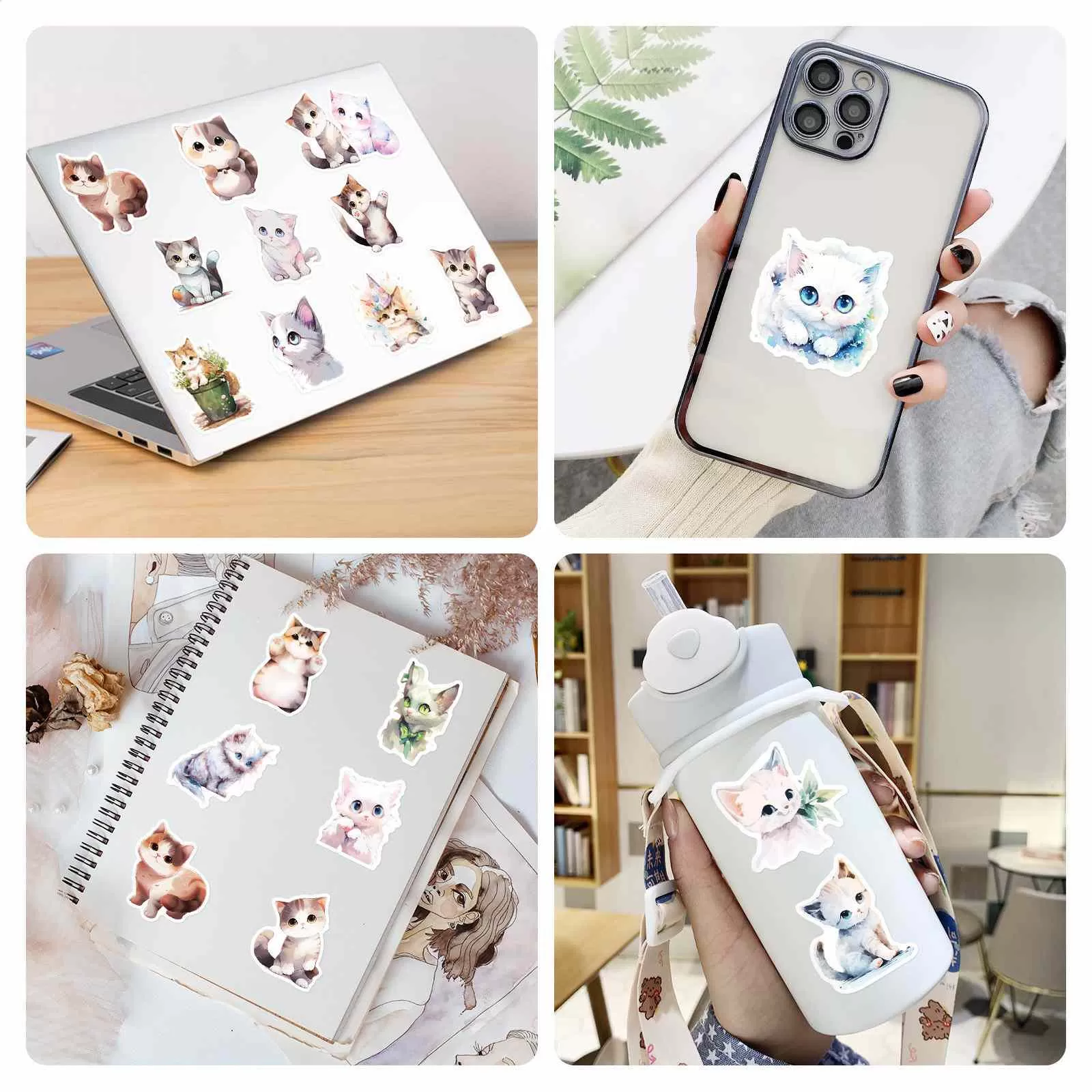 JIELEN 50 PCS Watercolor Bonsai Kitten Stickers, Cute Cartoon Cat Doodle Decals for Water Bottles, Laptop, DIY Scrapbook, Phone Case, Wall Art, Home Decor