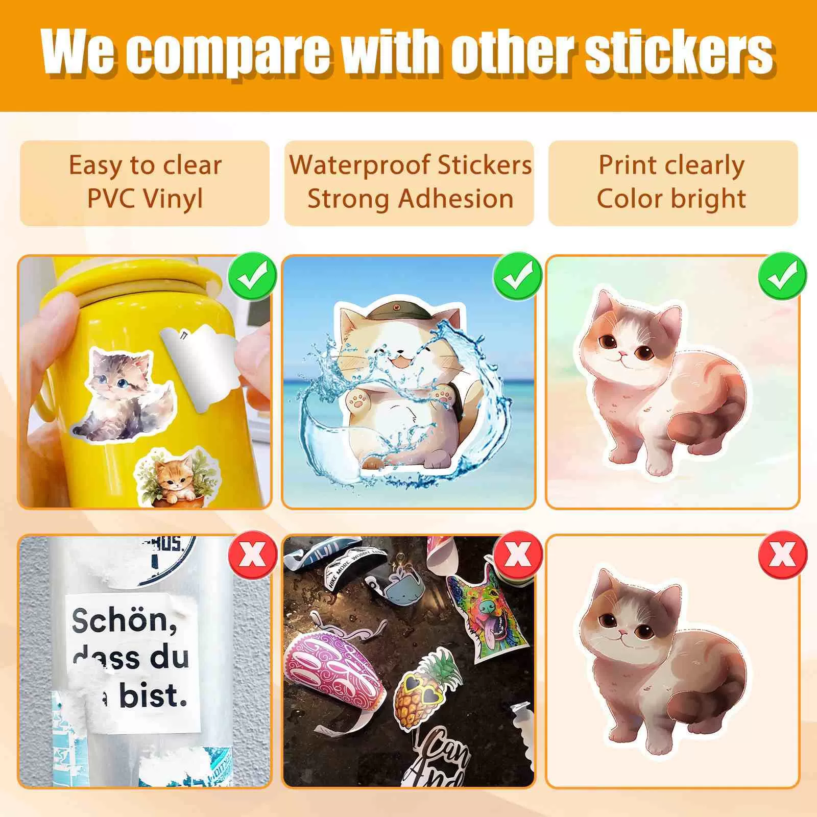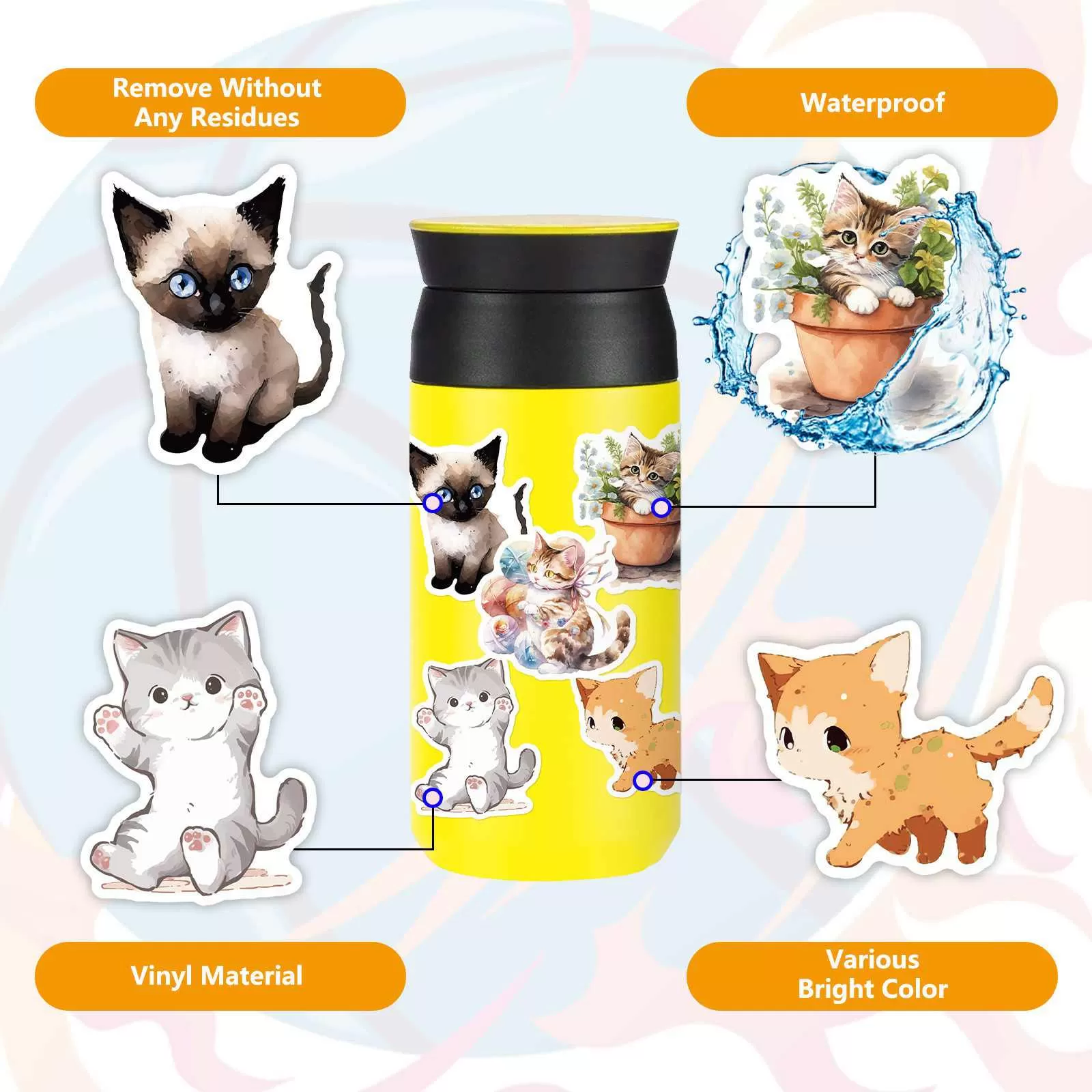 Rich Design & Premium Material: Features 50 unique cute kitten stickers in a charming watercolor and bonsai plant style. Made from durable, waterproof PVC film, these decals are scratch-resistant and won‘t fade, ensuring long-lasting vibrancy on your belongings.