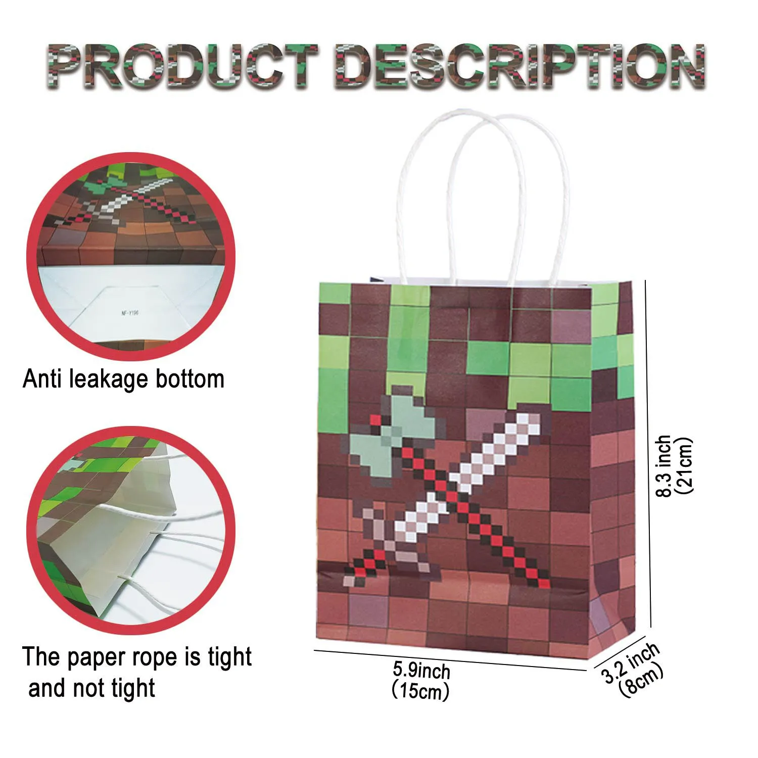 Product Packaging Details:This unique gift bag features a pixel-style design. Each pack contains 24 bags in 6 patterns, with 4 bags of each pattern. The paper bag measures (21cm X 15cm X 8cm).