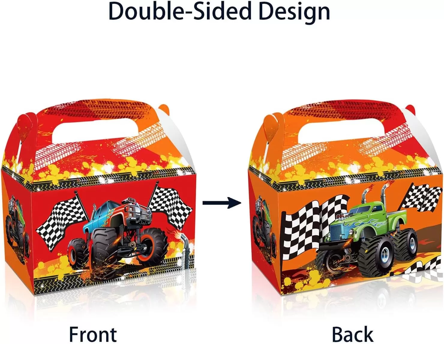 The Amount of Package : Includes 12 race car favor boxes, suitable for parties of any size. Each bag features handles and a double-sided design with 4 different patterns, making them easy to carry.