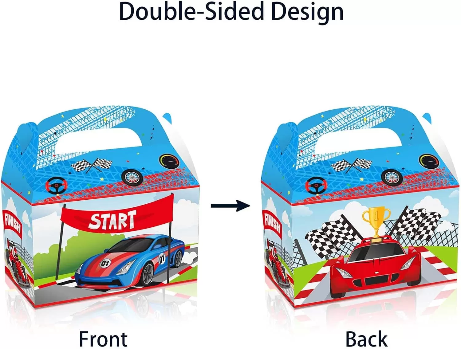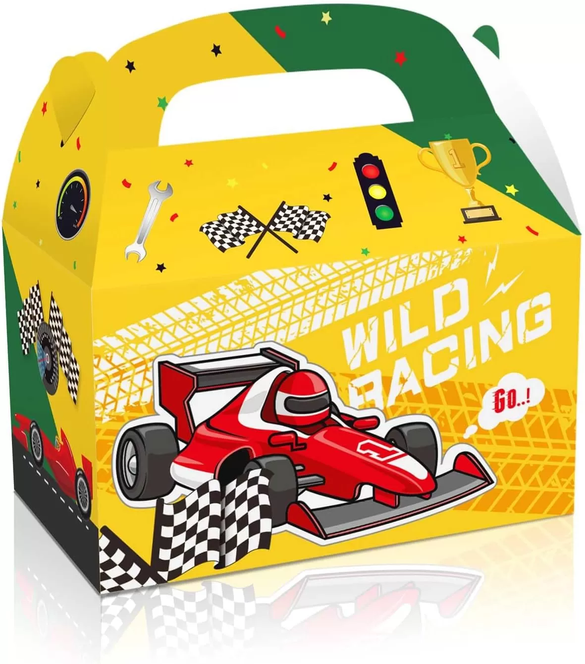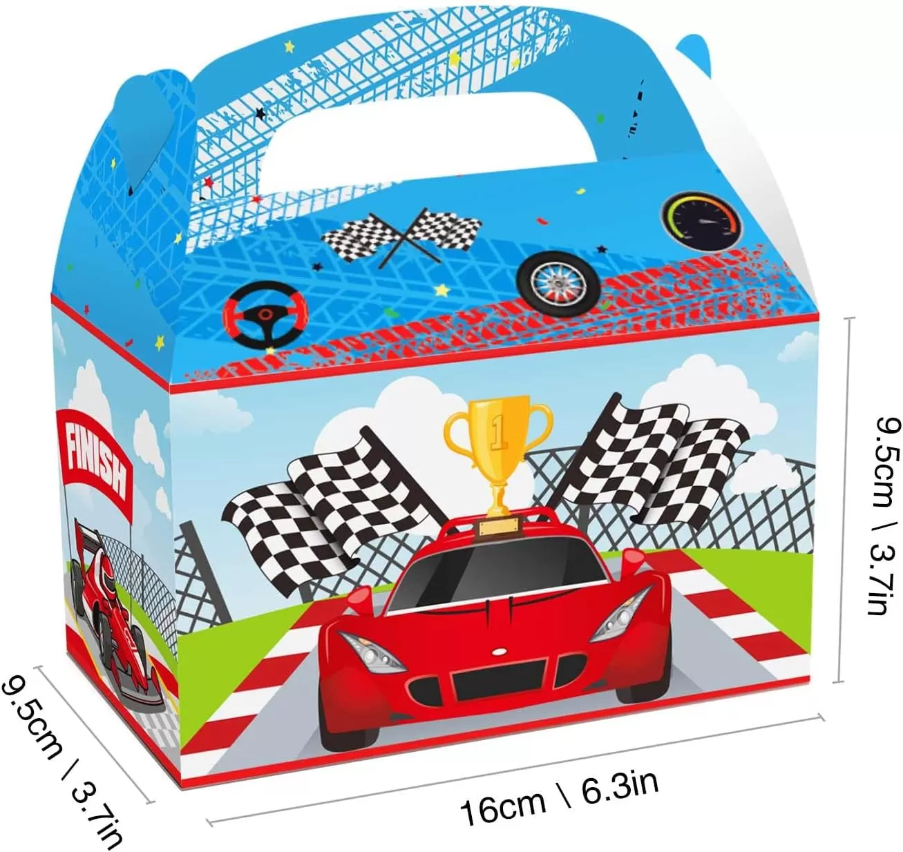 Package dimensions: You will get a racing car party supply package of 12 car theme gift boxes in 4 patterns, 3 pcs of each style. Each paper gift box measures 6.3 x 3.9 x 3.9 inches/16cm x 9.5cm x 9.5cm, roomy enough for candies, crafts and various presents.